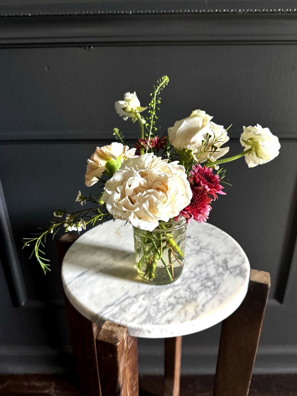 Garden style mix of garden roses, ranunculus, carnations, and mums with airy greenery. Each mini arrangement is styled in a mason jar for a fresh, effortless pop of beauty anywhere in your home.